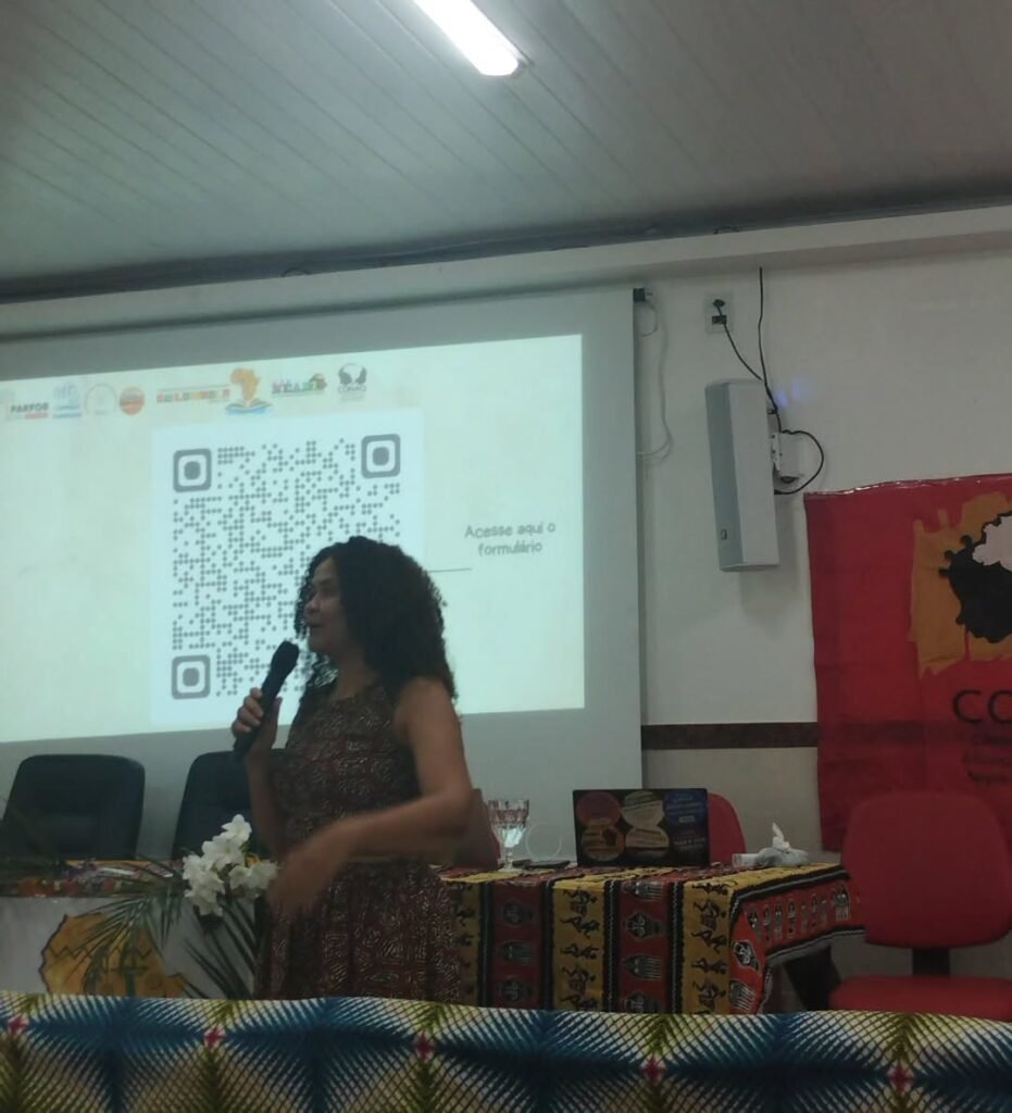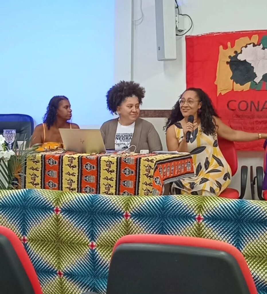 Pela manhã ocorreu a abertura do Curso e na aula da tarde, nos foi dada a oportunidade de conversar com os educadores quilombolas e realizar o chamamento para conhecerem nossa mobilização para a Marcha Nacional das Mulheres Negras. Lemos o Manifesto do Julho das pretas rumo à Marcha das Mulheres Negras por Reparação e Bem Viver e reforçarmos a importância das comunidades quilombolas protagonizarem a construção de comitês.